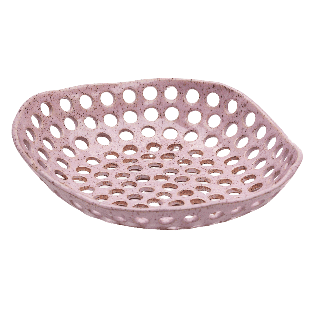 Each market basket is thoughtfully handbuilt, with special attention paid to the size and placement of perforations. The interplay between the rustic pink glaze and speckled brown clay creates unique characteristics in every piece. These natural variations celebrate the beauty of handcrafted ceramics, making each basket truly one-of-a-kind.