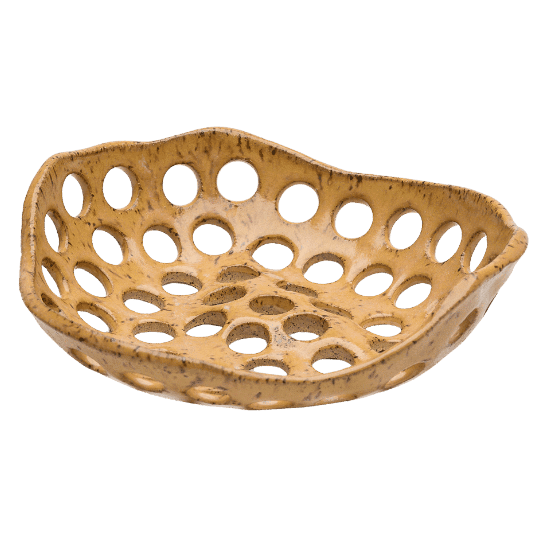 Handcrafted ceramic fruit basket with organic form and ochre glaze. Ventilation holes keep produce fresh while creating an artful centerpiece display.