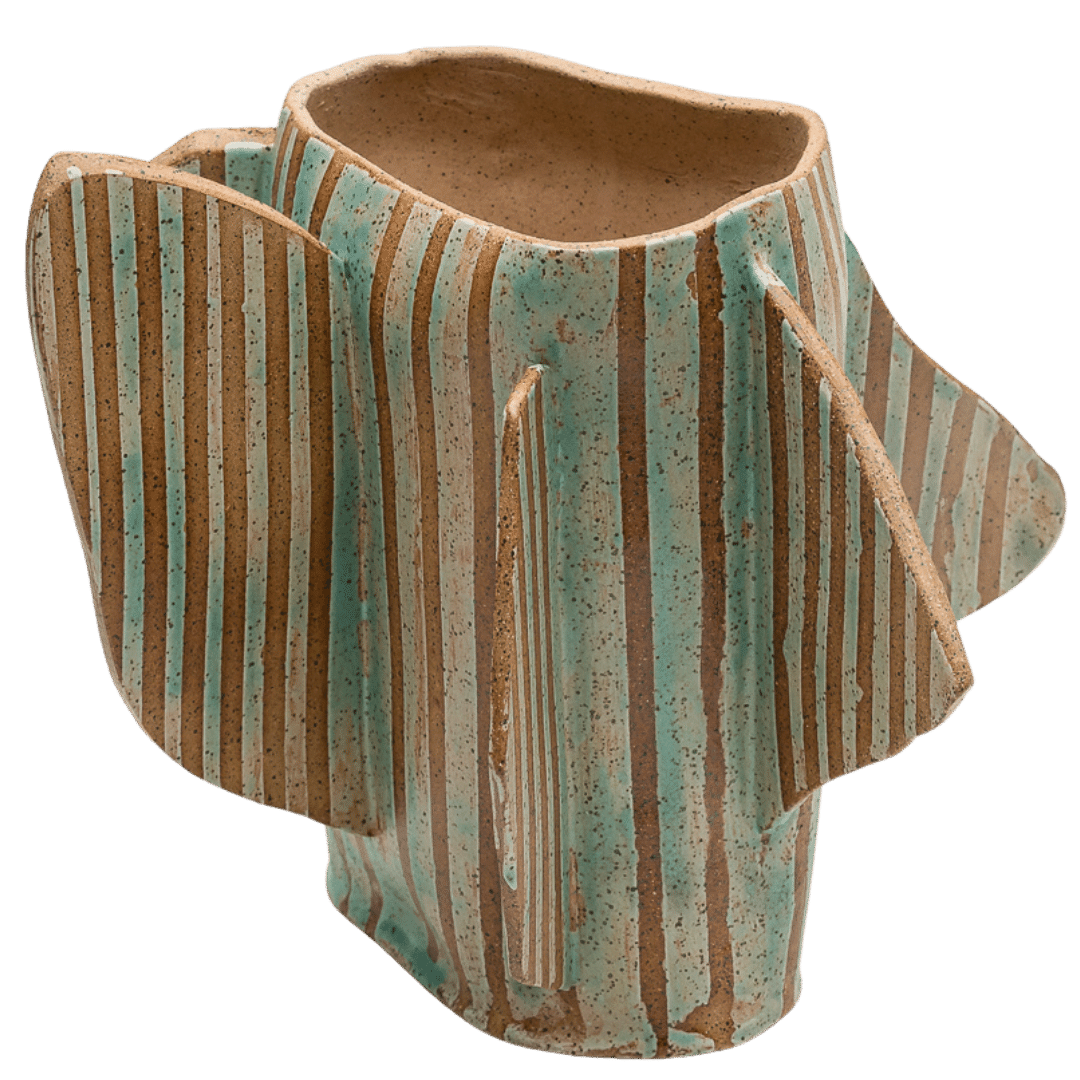 Part of our Linea Collection, this geometric ceramic vase represents our bold exploration into modern sculptural forms. Sharp triangular planes rise dramatically from an oval base, creating a modernist interpretation of natural crystalline forms. Each facet features a mesmerizing vertical stripe pattern, where Mexican green glaze alternates with raw speckled clay, creating an optical dance of light and shadow. The substantial scale and architectural presence make this piece equally striking as a functional vessel or standalone sculptural element.